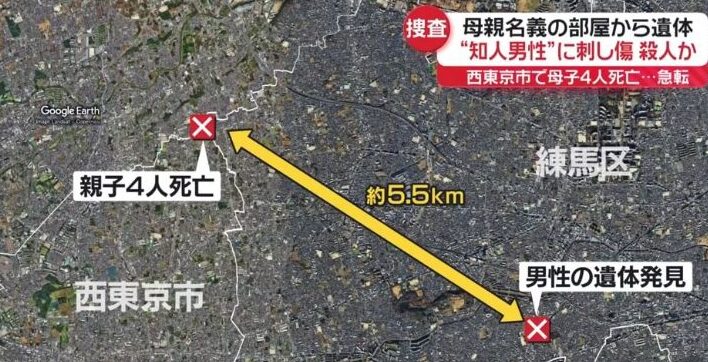 東京都西東京市の住宅で、住人の母子4人が無理心中したとみられる事件。